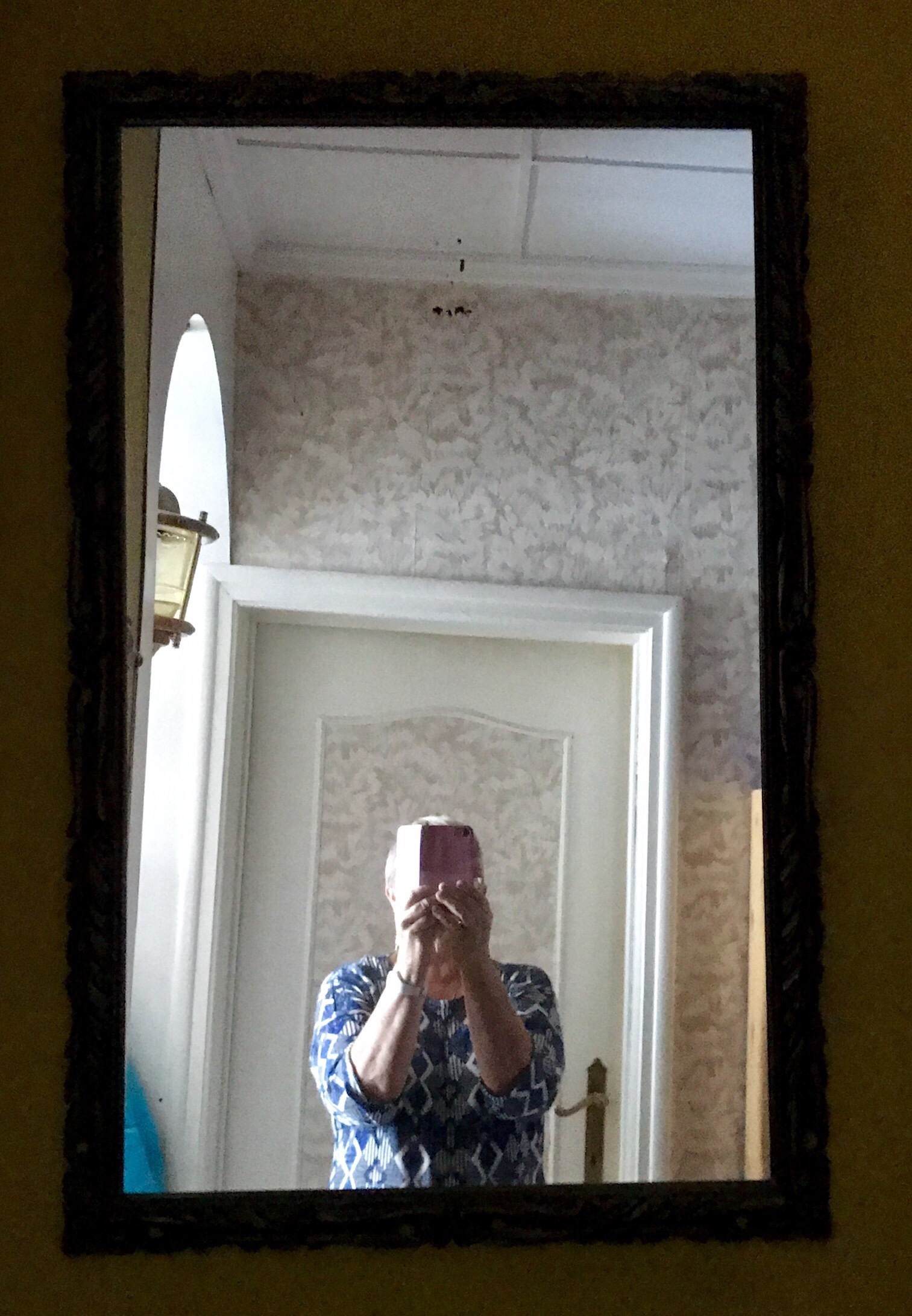 Nog altijd hing die spiegel op dezelfde plek op de trap.