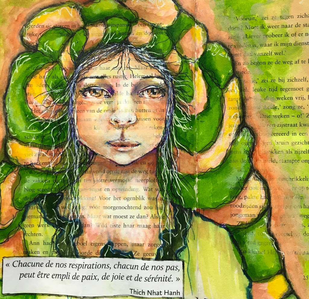 Het meisje ontstond spontaan. Ze draagt een eigen verhaal, dat ik niet ken, omdat ik de tekst in het oude boek nooit gelezen heb… Iedereen heeft ongelezen verhalen in zich… het is niet altijd nodig deze te vertellen. Ze zijn er, en vaak is dat meer dan genoeg. Die gedachte bracht ook rust. Gemoedsrust… die ik kwijt leek te zijn geraakt…