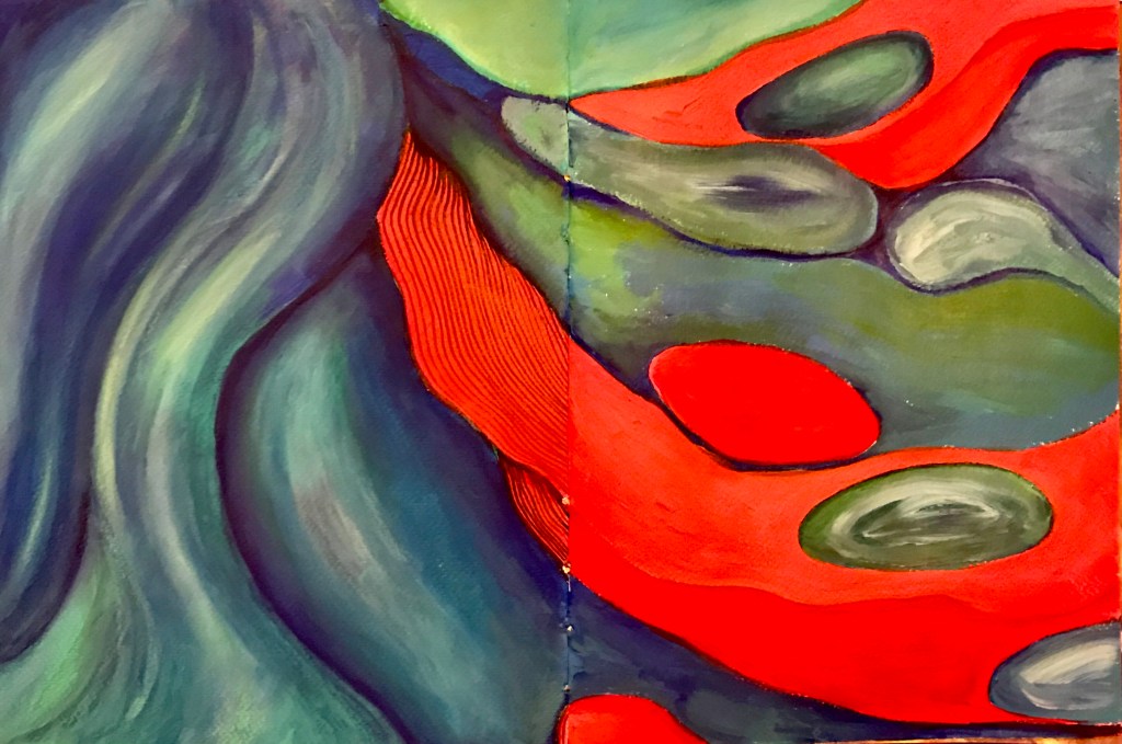 Ik ging met bibberende handen en vingers toch aan mijn tafel zitten in mijn creatief paradijsje, eventjes toch doopte ik mijn rossige synthetische borstel in de verf en zette een aarzelende streep op papier. Blauw.