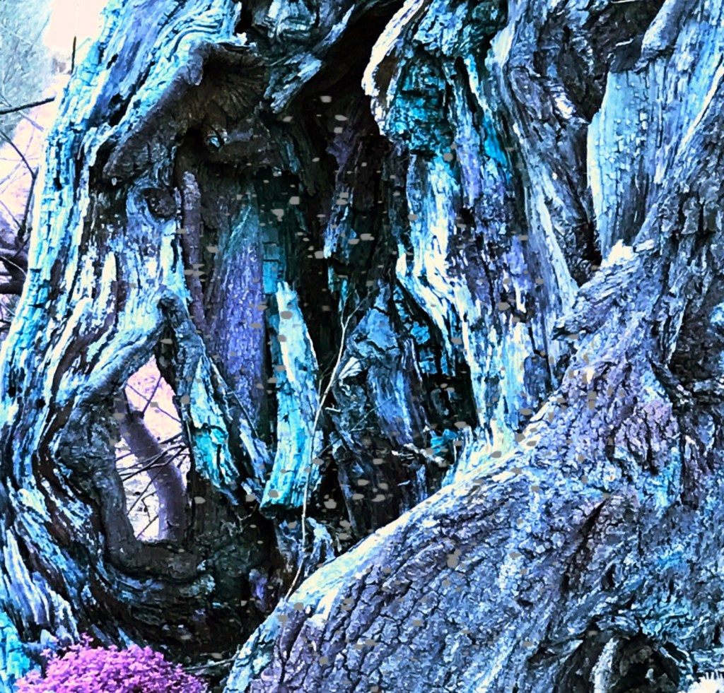 Ik verlies mezelf in het kijken naar de diepe dalen, de onverwachte openingen, de verwarde takken en chaotische schors.