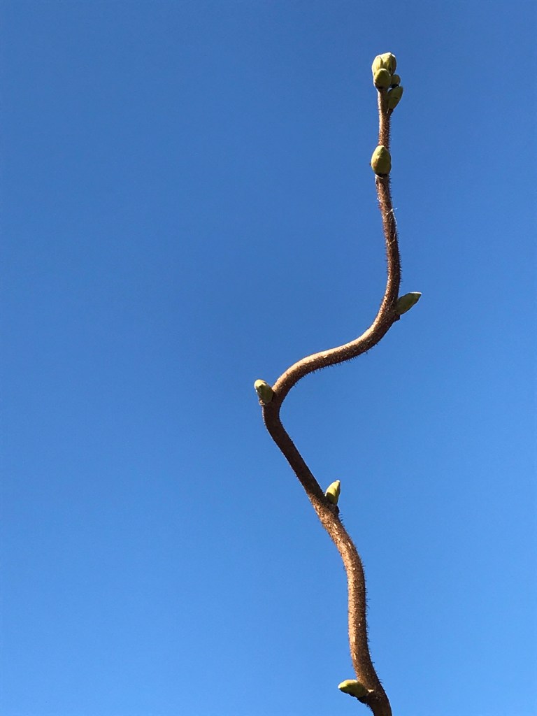 Ik zie hoe de bovenste tak van de krulhazelaar tot barstens toe vol knopjes, zo hoog mogelijk naar de diepblauwe lucht reikt…