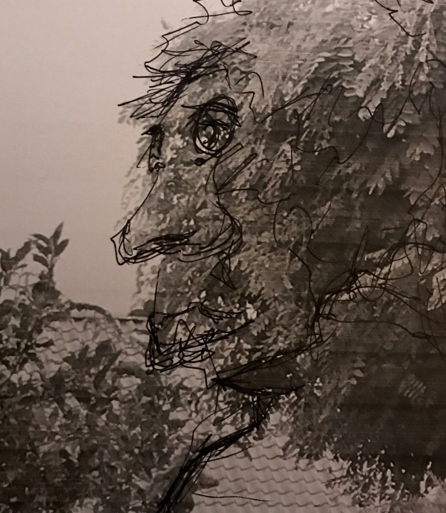 In de bladeren, en het dak… zag ik de oude, wijze man die mijn hele raam bijna vulde… Zijn haar en baard waaiden mee met de wind… Hij keek me aan en gaf me de nodige goede raad… Hij deed me relativeren. Hij bood oplossingen waar ik ze niet zag. Hij was vast een soort sjamaan of zo…