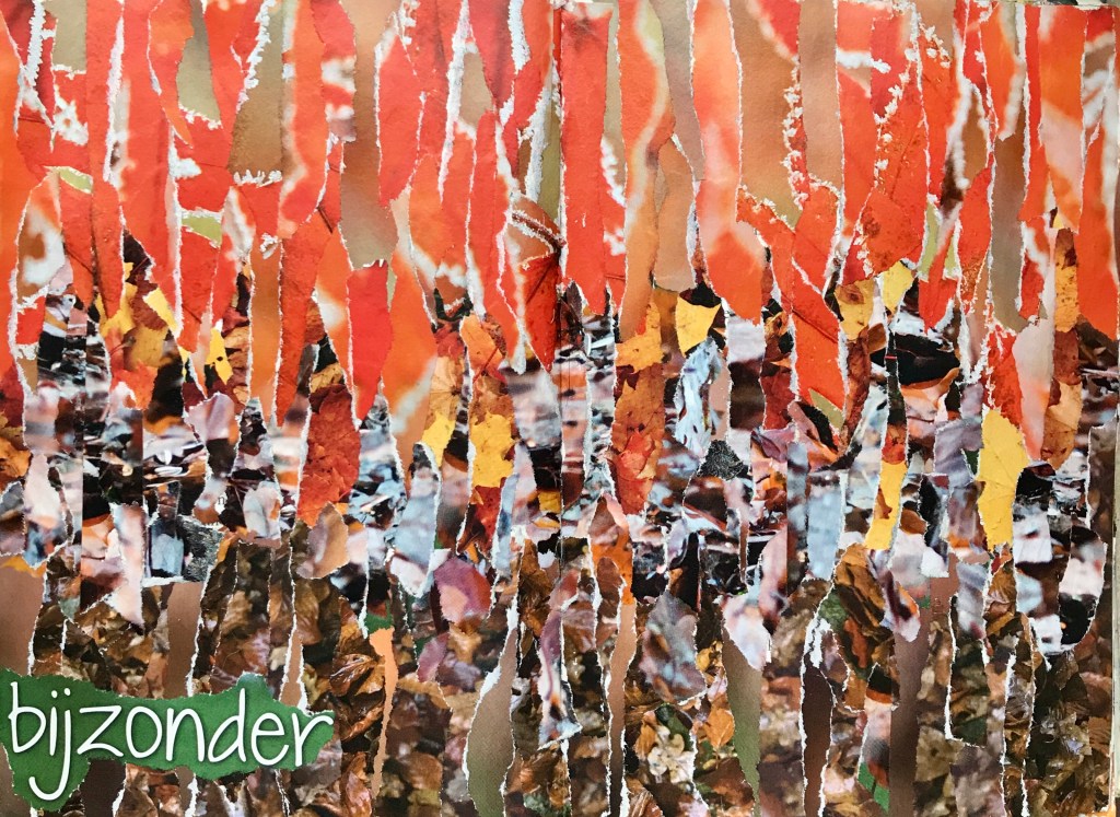 Ik neem een van mijn oude boeken en ik begin aan een collage. Ieder reepje papier dat ik op mijn bedrukte bladzijden kleef, is een herfsttafereeltje op zich… Stukjes afgevallen blad. Oranje verkleurde blaadjes van een struik. Het is een allegaartje dat ik opbouw van onder naar boven…