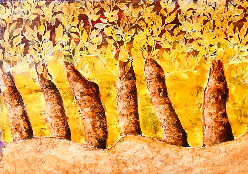 Als ik me dan aan mijn tafel bij het raam zet om iets te gaan schilderen, grijpen mijn handen naar kleuren die het witte papier omtoveren in een uitspatting van gelen, en er verschijnen vormen van ontluikende blaadjes die suggereren dat ze kronen zijn van bomen die na een winter in hun sapstroom voelen dat het tijd is voor lente en leven.